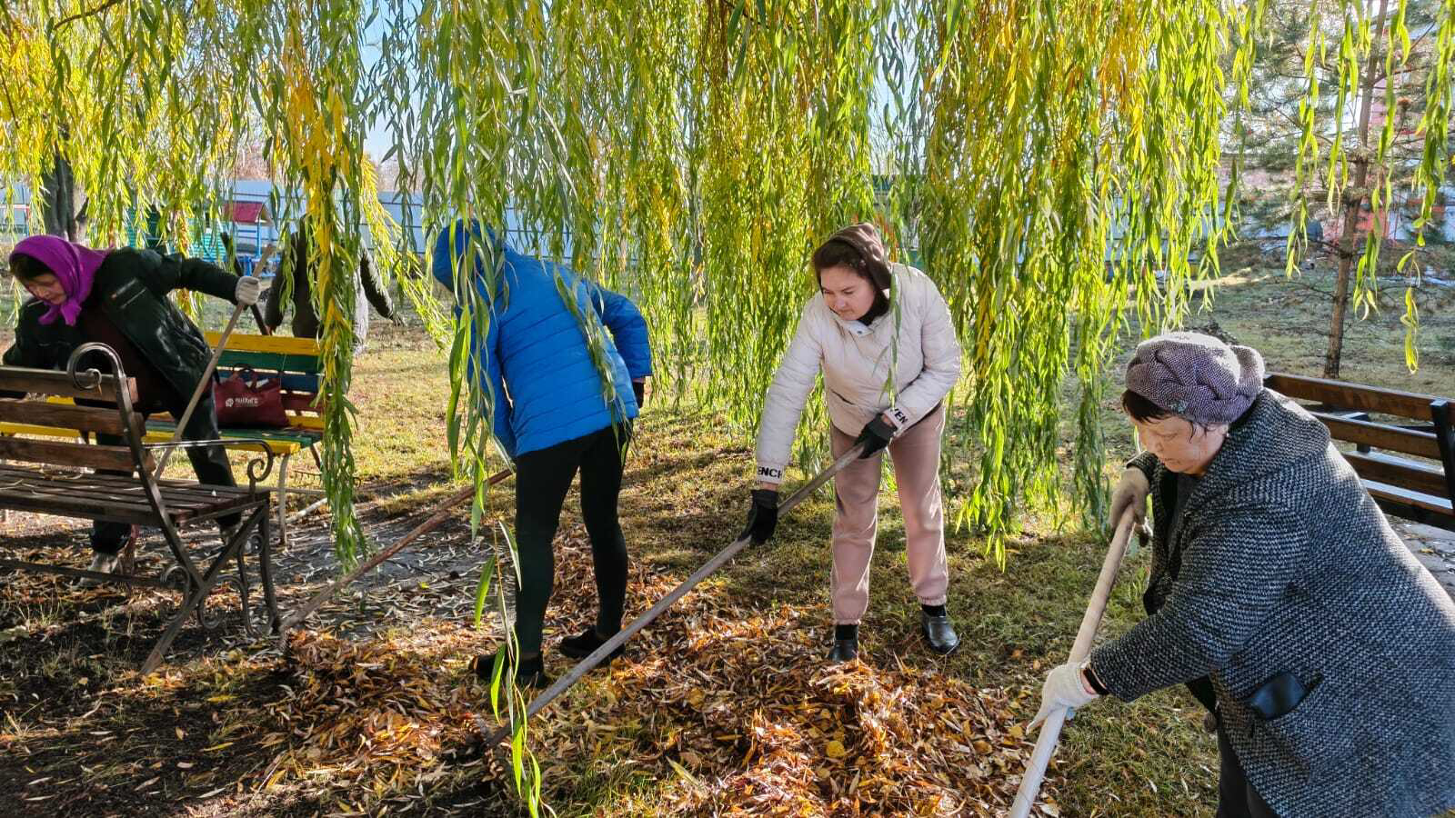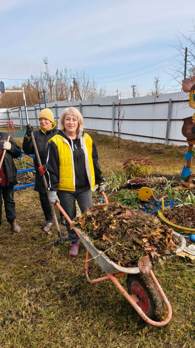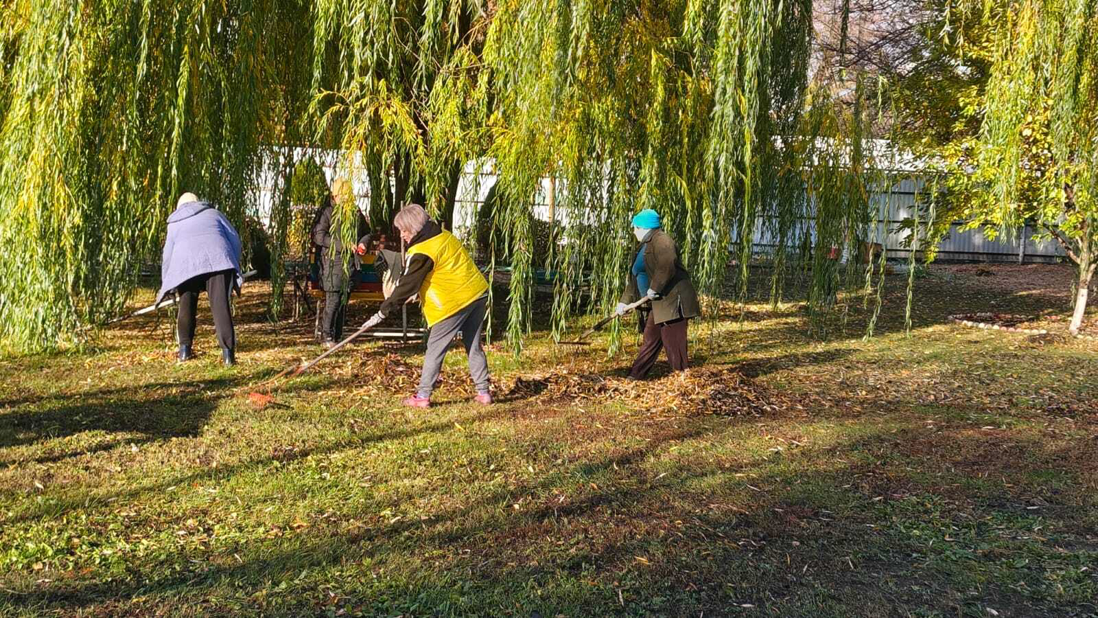 Сотрудники дружной командой взялись за дело, вооружившись граблями и метлами. Каждый старательно сгребал опавшую листву и подметал дорожки, делая наш центр еще более красивым и уютным.