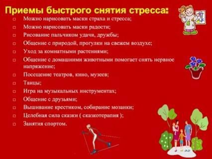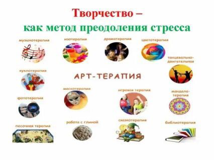 Занятия творчеством способны не только развивать и развлекать вашего ребенка, но и поможет расслабиться , поверить в себя, бороться со страхами. У детей как и у взрослых могут быть различные причины возникновения стрессовых ситуаций . Важно вовремя заметить и помочь ребенку успешно справиться с эмоциональным напряжением . Самым эффективным методом преодоления стресса является арт-терапия в основе которой лежит терапевтический эффект искусства и художественное творчество ребенка. Занятия могут быть разными ,но главное интересными для ребенка! Примеры занятий творческой деятельности :лепка , рисование(нетрадиционные способы),конструирование, аппликация, занятия музыкой и танцами, театрализованная деятельность, сказкотерапия, посещение культурных мероприятий .